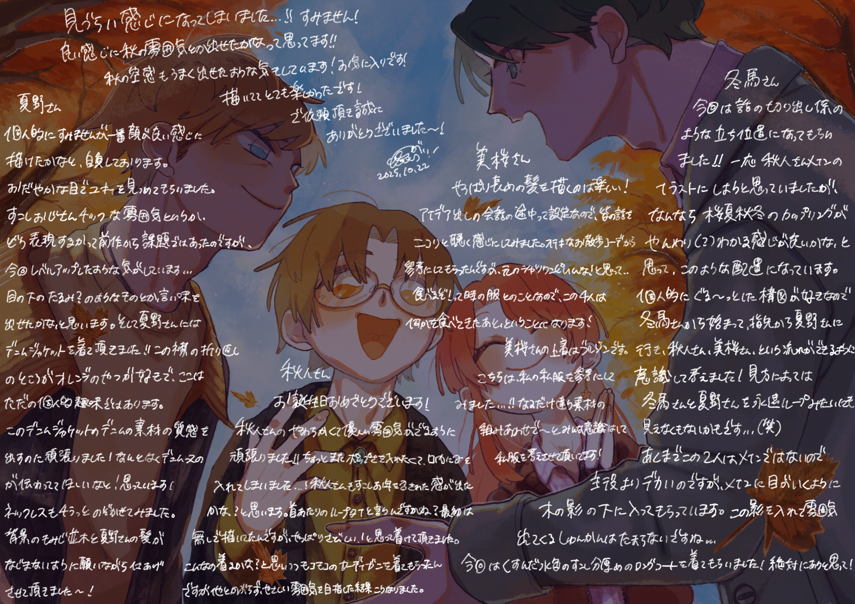 いつもは自分でお祝いしておりましたが、今年はなんと「がい子さん」に秋めいた四人のイラストにてお祝いしていただきました٩(๑>∀<๑)۶ご依頼を受けて頂きまして誠にありがとうございました!!