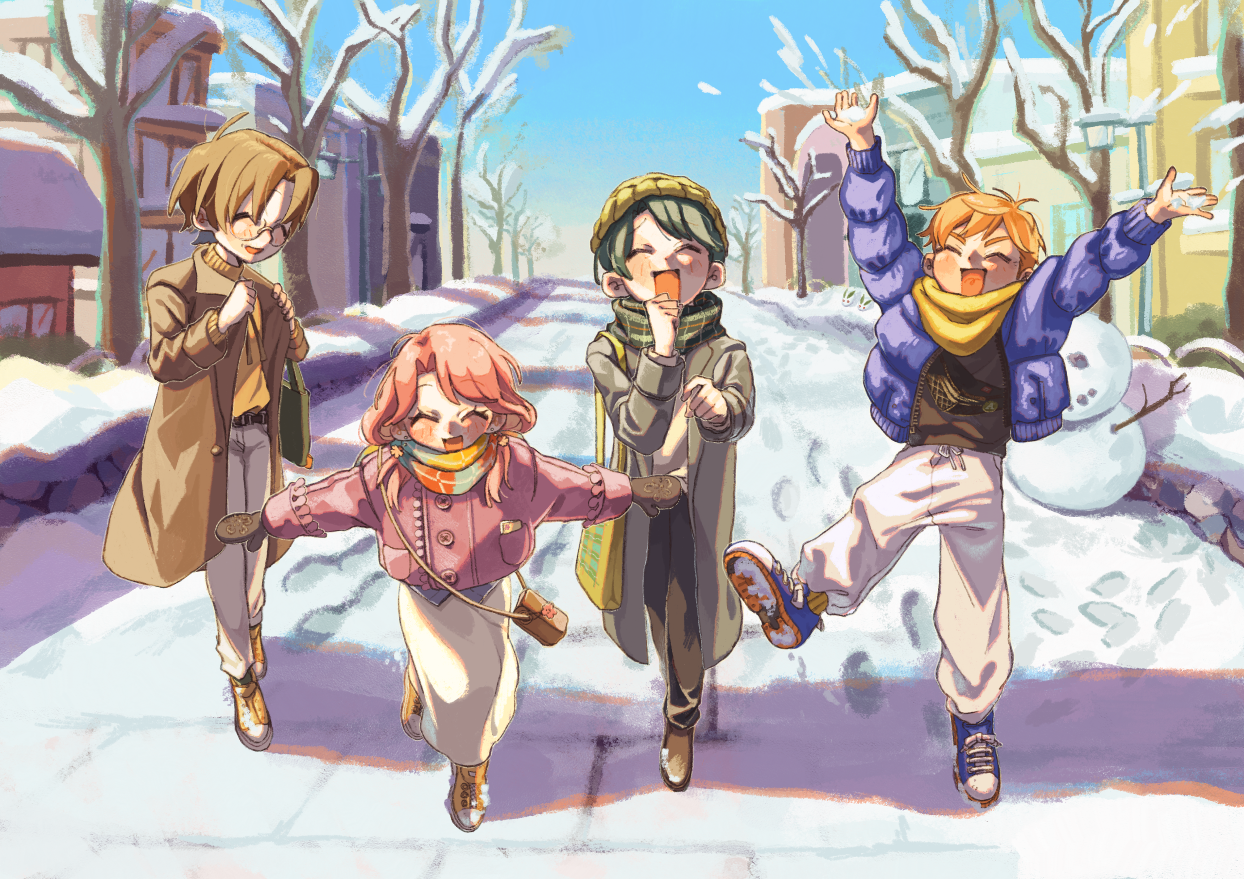 冬の街並みの中、雪遊びを楽しんだ直後の四人という、なんとも微笑ましく幸せな1枚を描いて頂きました…!四人のこの笑顔よ…!!特に冬馬さんの嬉し楽しそうな表情がたまらないですね…!!