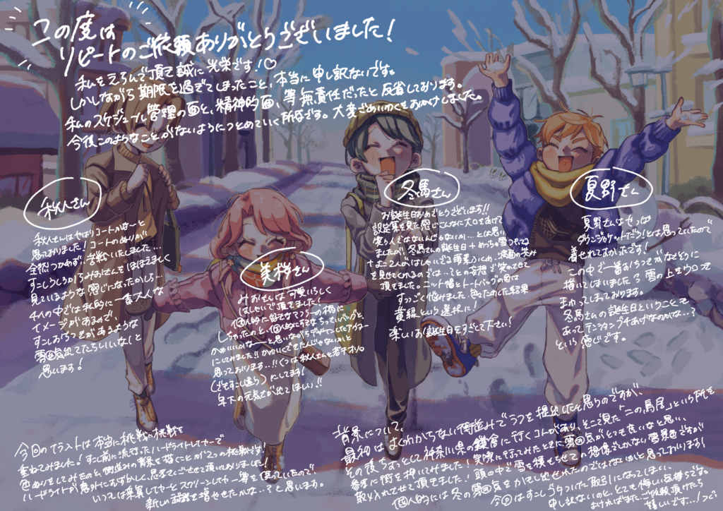 また衣装が四者四様で最高です…!シックでフォーマルな秋人さんに、冬でもピンクコーデが可愛らしい美桜ちゃん、落ち着いた色合いで誰よりも防寒している冬馬さんに、スポーティーでビビットな冬の装いの夏野。四人共個性が出つつも、しっかりと彼ららしく、それでいてまとまりがとれた衣装に設定して頂いていて凄く嬉しかったです!