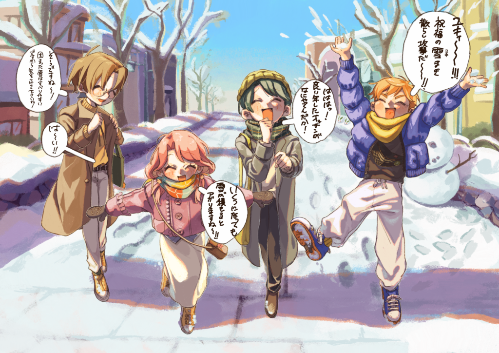 皆の足元や、夏野の手に残っている雪であったり、雪ウサギや雪だるまの近くの足跡から、さっきまで雪遊びを楽しんでいたんだな~と想定出来てニヤニヤしてしまいました🤭見れば見るほど幸せを噛みしめられて、流石のがい子さんでございました👏✨
