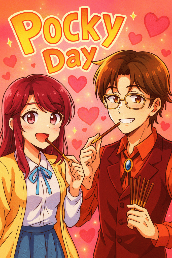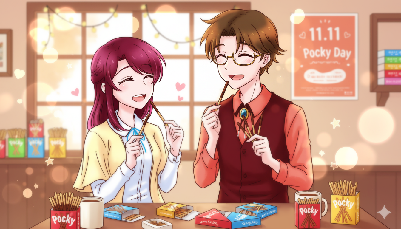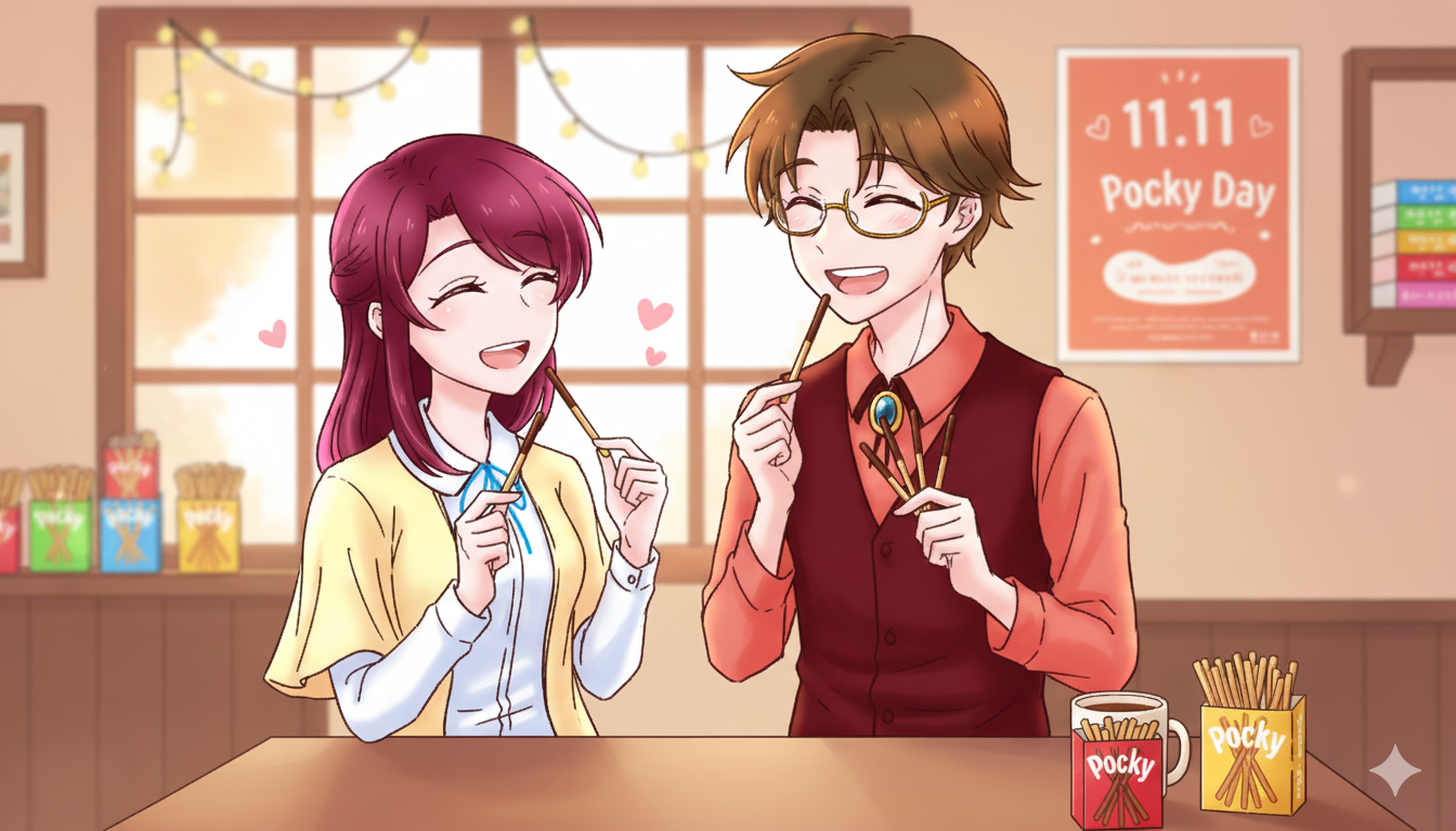 この男女のキャラクターを用いて、ポッキーの日としてふさわしい映えるイラスト画像を生成してください。キャラクターにポッキーを持たせて楽しそうにしてください。背景等はイラストとして映える様に良い感じに追加してください。