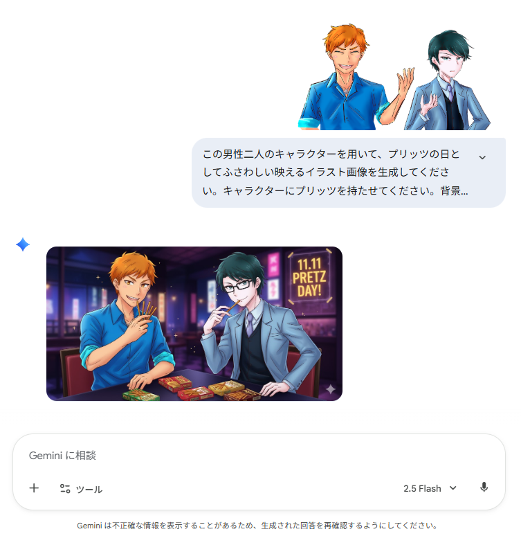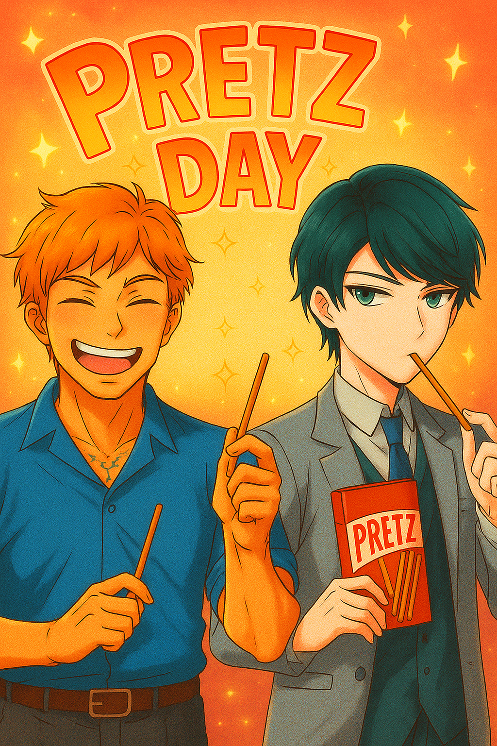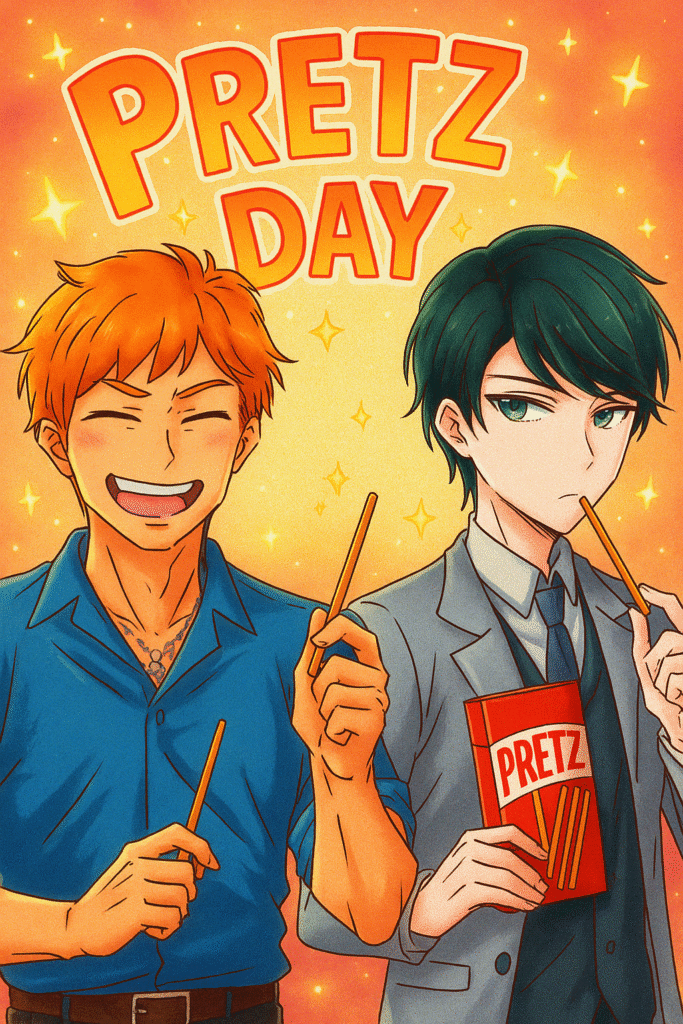 この男性二人のキャラクターを用いて、プリッツの日としてふさわしい映えるイラスト画像を生成してください。キャラクターにプリッツを持たせてください。背景等はイラストとして映える様に良い感じに追加してください。クールに格好良くそれでいて楽しそうな雰囲気だと嬉しいです。イラストとしておかしくない様に注意して出力してください。