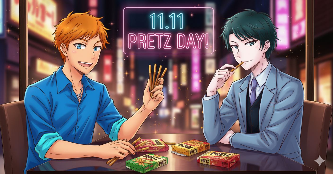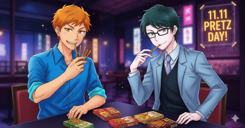 この男性二人のキャラクターを用いて、プリッツの日としてふさわしい映えるイラスト画像を生成してください。キャラクターにプリッツを持たせてください。背景等はイラストとして映える様に良い感じに追加してください。楽しそうな雰囲気だと嬉しいです。ただ左の男性は快活ですが、右の男性はクールな性格です。正確に合う様にして欲しいです。加えてイラストとしておかしくない様に注意して出力してください。
