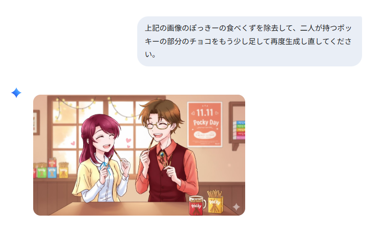 上記の画像のポッキーの食べくずを除去して、二人が持つポッキーの部分のチョコをもう少し足して再度生成し直してください。