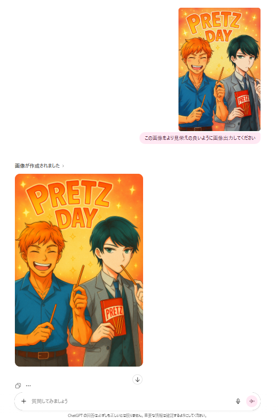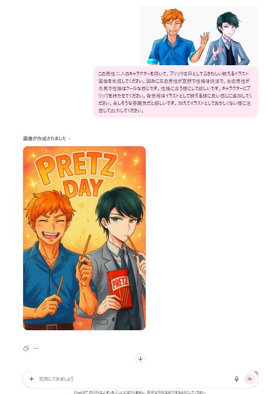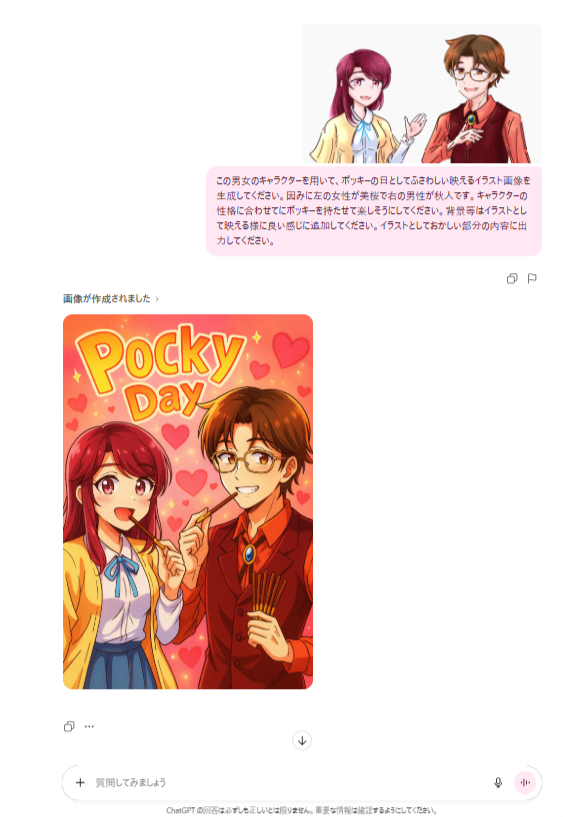 チャッピー先生は元画像からガラッと変えて出力してくれるので、いつも生成時の待ち時間がとっても楽しかったりします💓しっかし、ま~た秋人さんは沢山ポッキー持ってるよ(笑)すきねぇ~🤭