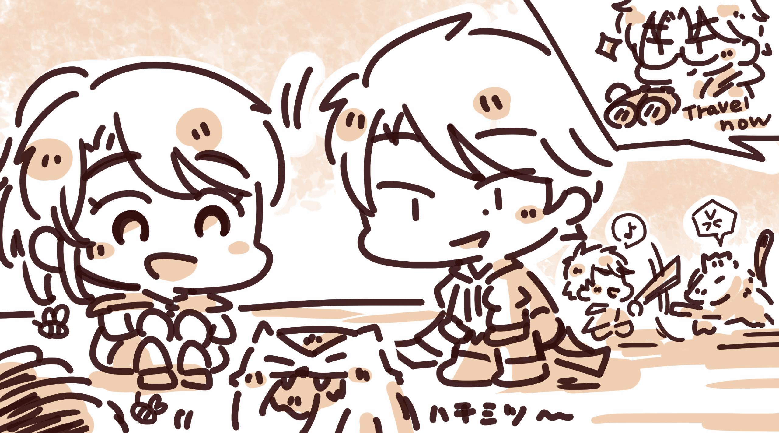 • 四人で環境探索に行ったら。ゆきみおは楽しみそう。美桜ちゃんは純粋にフィールドを楽しんで、冬馬さんは、ゲームの作りこみに魅入ってそう。冬馬さん、美桜ちゃんに「この子可愛くないですか~?」って話かけられたら、必要ないけど、きちんとモーションを使って、しゃがみこんで話を聞きそう🤭その間、夏野は近くの小型生物を倒したり。秋人さんは、レアアイテム回収や、良質なクエスト保存に回り、呼ばれたら、さもその場にいたようにしれっと戻ってきそう😎夏野だけは、あきのめざとい行動に気づいていそうです(笑)